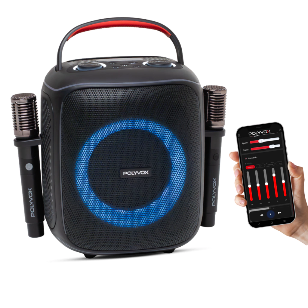 Caixa de Som Karaokê Polyvox XK-1 – 160W RMS, Bluetooth 5.3, Show de Luzes Com microfones inclusos