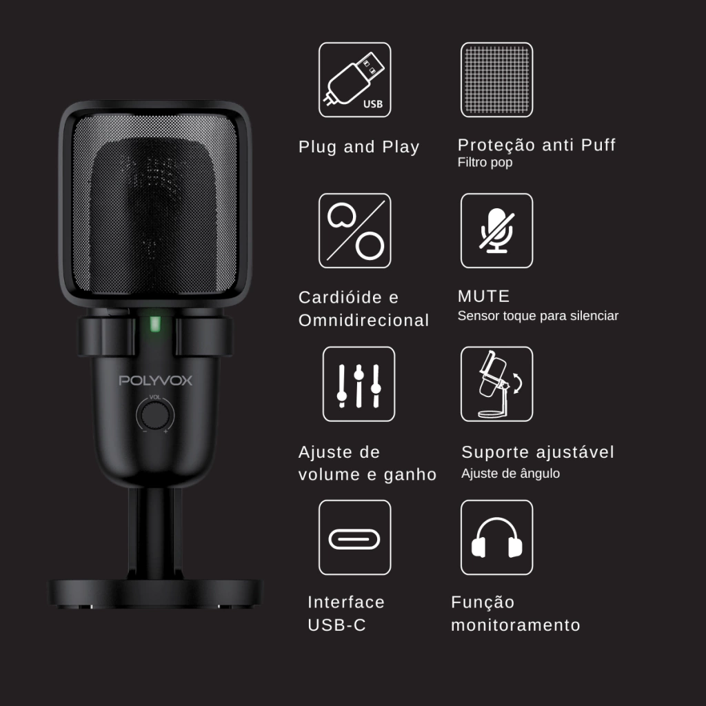 Ideal para músicos, podcasters, streamers, dubladores e criadores de conteúdo que buscam qualidade e praticidade em um único equipamento.
